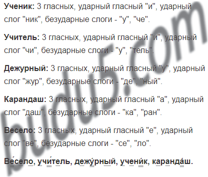 Сколько гласных в каждом слове? Назови ударные гласные, ударные слоги, безударные слоги в этих словах.