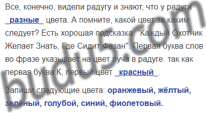 Все, конечно, видели радугу и знают, что у радуги ______________ цвета. А помните, какой цвет за каким следует? Есть хорошая подсказка: "Каждый Охотник Желает Знать, Где Сидит Фазан". Первая буква слов во фразе указывает на цвет луча в радуге. так как первая буква К, первый цвет _____________.