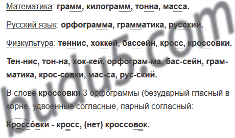 Прочитай. Какие слова ты чаще используешь на уроках математики, русского языка, физкультуры? Запиши слова в три группы. Подчеркни удвоенные буквы.