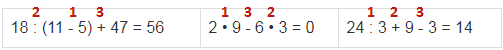 | 18 : (11 - 5) + 47 = 56 1) 11 - 5 = 6 2) 18 : 6 = 3 3) 3 + 47 = 50 | 2 • 9 - 6 • 3 = 0 1) 2 • 9 = 18 2) 6 • 3 = 18 3) 18 - 18 = 0 |