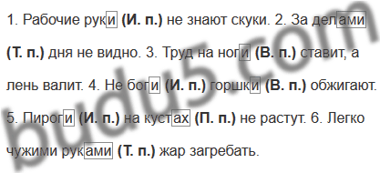 1. Рабочие руки не знают скуки. 2. За делами дня не видно. 3. Труд на ноги ставит, а лень валит. 4. Не боги горшки обжигают. 5. Пироги на кустах не растут. 6. Легко чужими руками жар загребать.