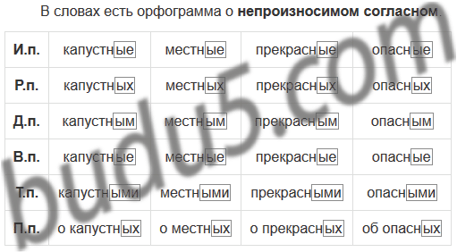 Письменно просклоняйте во множественном числе имена прилагательные капустный, местный, прекрасный, опасный. Какая орфограмма есть в этих словах?