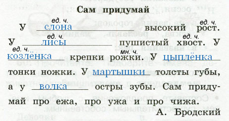 У ___ высокий рост. У ___ пушистый хвост. У ___ крепкие рожки. У ___ тонкие ножки. У ___ толсты губы, а у ___ остры зубы. Сам придумай про ежа, про ужа и про чижа.