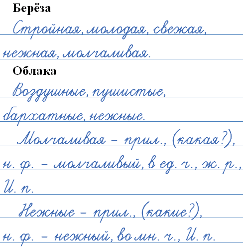 Аня и Ваня подобрали эпитеты к словам берёза и облака. Придумайте и запишите свои эпитеты.