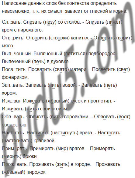 Сл..зать, отв..рить, выпяченный, посв..тить, зап..вать, изж..вать, обвивать, наст..гать, прим..рять, проживать, разр..дить, св..ла, сп..ши, ув..дать, частота.