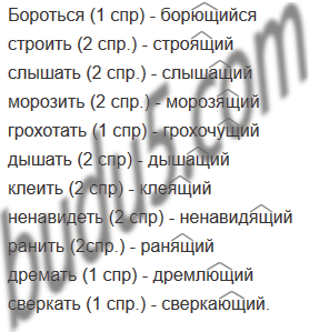 Бороться, строить, слышать, морозить, грохотать, дышать, клеить, ненавидеть, ранить, дремать, сверкать.