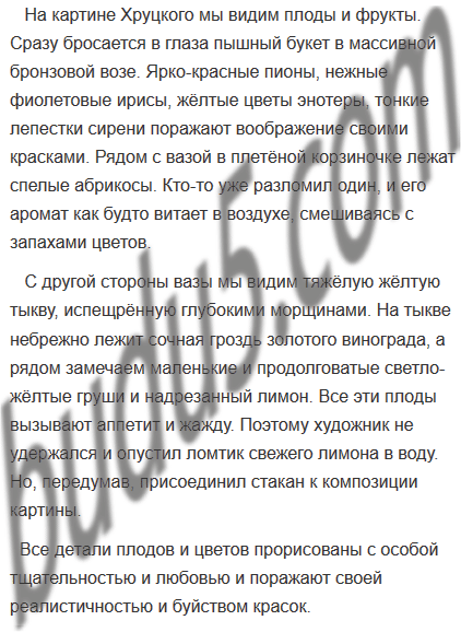Рассмотрите картину Ивана Трофимовича Хруцкого (см. цветную вклейку, с. 8). Какие цветы и плоды вы любите? Почему? Опишите общее впечатление от картины так, чтобы можно было воочию увидеть натюрморт. Расскажите об отдельных цветах и плодах, которые чем-то вас поразили. Посоревнуйтесь с художником: он изобразил картину красками, а вы попробуйте «нарисовать» её словами. Вы, конечно, поняли уже, что стиль речи должен быть художественный.