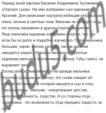 Напишите сочинение по картине Василия Андреевича Тропинина (1776—1857) «Портрет сына» (1818) (см. вклейку, с. 6). Помните, что настоящий художник стремится увидеть и отобразить в портрете личность человека, его характер, а не просто создать «фотографию». Постарайтесь и вы в своём сочинении передать те мысли и чувства, которые вложил в портрет художник.