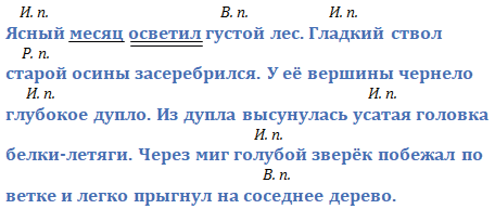 1. Ясный, осветил, густой, месяц, лес. 2. Гладкий, засеребрился, осины, ствол, старой. 3. У, чернело, её, глубокое, вершины, дупло. 4. Из, высунулась, усатая, головка, дупла, белки-летя́ги. 5. Через, миг, голубой, побежал, ветке, по, зверёк, на, прыгнул, дерево, легко, соседнее, и.