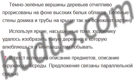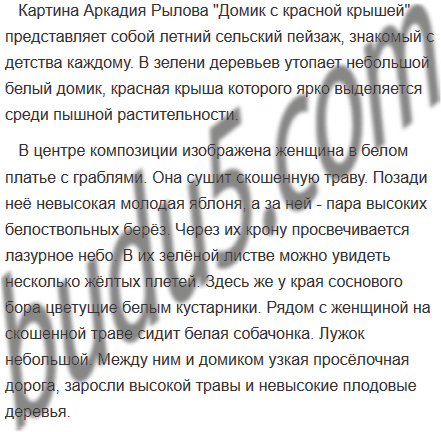 1. Внимательно рассмотрите репродукцию картины «Домик с красной крышей» известного русского художника Аркадия Александровича Рылова (1870—1939) (см. цветную вклейку, с. 5). Дайте словесную зарисовку картины: опишите небо, облака, деревья, домик с красной крышей, гармонично вписавшийся в лесной пейзаж, опушку перед домом с рядами скошенной травы, женщину в жёлтом, ворошащую сено; передайте состояние покоя и умиротворённости, которым веет от холста.