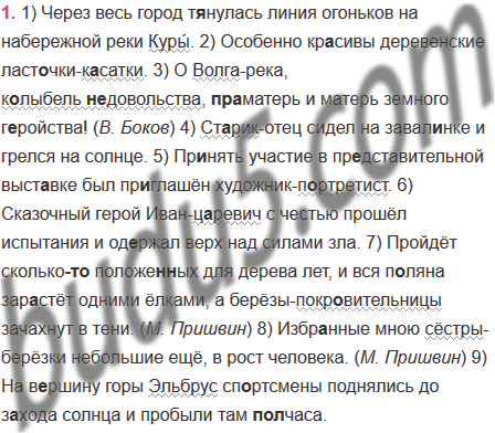 1) Через весь город т..нулась линия огоньков на набережной реки Куры́. 2) Особенно кр..сивы деревенские ласт..чки к..сатки. 3) О Волга река, к..лыбель (не)довольства, (пра)матерь и матерь земного г..ройства! (В. Боков) 4) Ст..рик отец сидел на завал..нке и грелся на солнце. 5) Пр..нять участие в пр..дставительной выст..вке был пр..глашён художник п..ртретист. 6) Сказочный герой Иван ц..ревич с честью прошёл испытания и од..ржал верх над силами зла. 7) Пройдёт сколько(то) положе..ых для дерева лет, и вся п..ляна зар..стёт одними ёлками, а берёзы покр..вительницы зачахнут в тени. (М. Пришвин) 8) Избр..нные мною сёстры берёзки небольшие ещё, в рост человека. (М. Пришвин) 9) На в..ршину горы Эльбрус сп..ртсмены поднялись до з..хода солнца и пробыли там (пол)часа.
