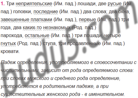 1. Прочитайте примеры из произведений писателей-клас-сиков. Укажите, в каком падеже употреблено определение в словосочетании с числительными два, три, четыре в каждом предложении. От чего это зависит? Соответствует ли это правилам согласования, изложенным под рубрикой «Возьмите на заметку!»?