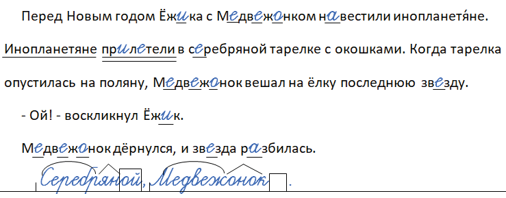 Значимые части слова в которых находятся пропущенный буквы: Перед Новым годом Ёжика с Медвежонком навестили инопланетя́не. Инопланетяне прилетели в серебряной тарелке с окошками. Когда тарелка опустилась на поляну, Медвежонок вешал на ёлку последнюю звезду.
