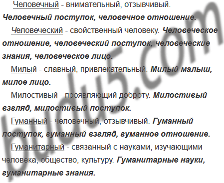 Человечный - человеческий, милый - милостивый, гуманный - гуманитарный.