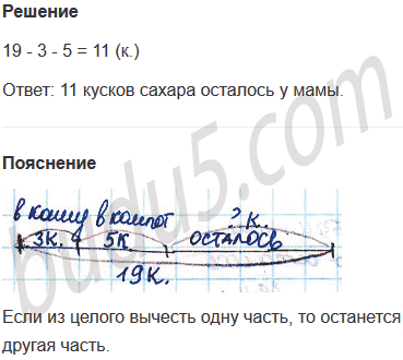 Задание № 7. У мамы было 19 кусков сахара. 3 куска она положила в кашу, а 5 кусков - в компот. Сколько кусков сахара осталось у мамы?