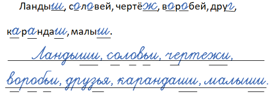 Ландыш –ландыши, соловей – буквосочетание -оло-, вторую О проверяем соло́вушка, чертеж – чертежи, воробей – буквосочетание -оро-, воро́бушек, друг – подруга (звонкие и глухие согласные в корне слова), карандаш – гласные проверяем словарем, Ш – карандаши, малыш – малыши.