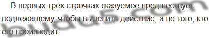Прочитайте скороговорку. Как вы думаете, почему в трёх первых строчках сказуемое предшествует подлежащему?