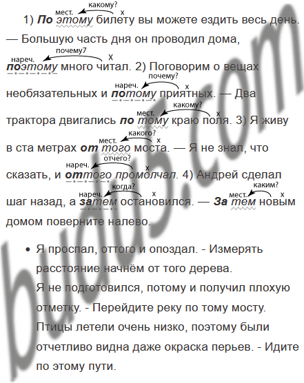1) (По)этому билету вы можете ездить весь день. — Большую часть дня он проводил дома, (по)этому много читал. 2) Поговорим о вещах необязательных и (по)тому приятных. — Два трактора двигались (по)тому краю поля. 3) Я живу в ста метрах (от)того моста. — Я не знал, что сказать, и (от)того промолчал. 4) Андрей сделал шаг назад, а (за)тем остановился. — (За)тем новым домом поверните налево.