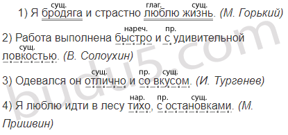 1) Я бродяга и страстно люблю жизнь. (М. Горький) 2) Работа Выполнена быстро И С удивительной ловкостью. (В. Солоухин) 3) Одевался он отлично и со вкусом. (И. Тургенев) 4) Я люблю идти в лесу тихо, с остановками. (М. Пришвин)