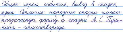 ♦ Что общего у народной сказки и у сказки Пушкина? Запиши, используя опорные слова: герои, события, вывод в сказке, язык, прозаическая или стихотворная форма.