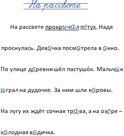 На рассвете прокр_ч_л п_тух. Надя проснулась. Дев_чка посм_трела в _кно. По улице д_ревни шёл пастушо́к. Мальч_к _грал на дудочке. За ним шли к_ровы. На лугу их ждёт сочная тр_ва, а на оз_ре - х_лодная в_дичка.