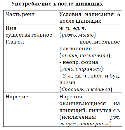 Спишите, вставляя, где нужно, вместо пропусков букву ь. На основании предыдущих упражнений и приведённых ниже примеров сделайте общие выводы о том, когда в именах существительных, глаголах, наречиях после шипящих пишется ь. Оформите свои выводы в виде таблицы "Употребление ь после шипящих". Подготовьте монологическое высказывание, послушайте и оцените друг друга. При обнаружении неточностей корректно поправьте своего одноклассника.