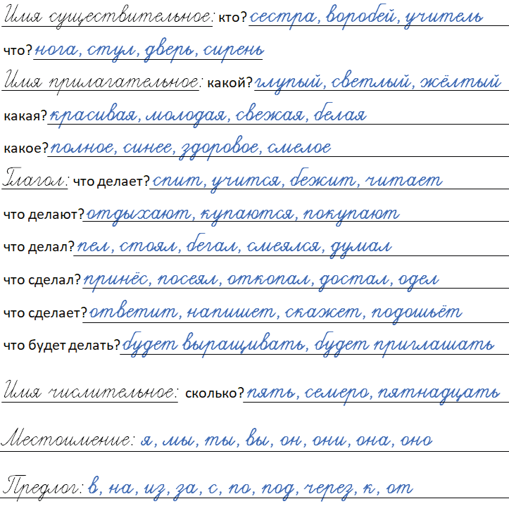 В справочнике ты можешь посмотреть примеры для каждой части речи.