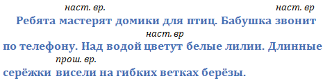 1. Ребята (мастерить) домики для птиц.4 2. Бабушка (звонить) по телефону. 3. Над водой (цвести) белые лилии. 4. Длинные2 серёжки (висеть) на гибких ветках берёзы.