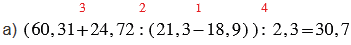 а) (60,31 + 24,72 : (21,3 - 18,9)) : 2,3;