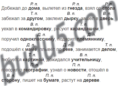Добежал до ..., вылетел из ..., взял со ..., забежал за ..., заклеил ..., зашёл в ..., уехал в ..., рисуют ..., поручил ..., подарил ..., подошёл к ..., плывёт по ..., занимается ..., любуется ..., дожидался ..., говорил о ..., узнал о ..., отошёл в ..., пишет на ..., растут на ... .