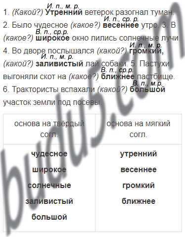 3. Выпишите в один столбик прилагательные с основой на твёрдый согласный, в другой столбик прилагательные с основой на мягкий согласный. Наблюдайте на этих примерах за окончаниями именительного и винительного падежей.